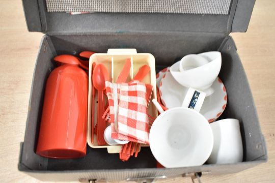 A large selection of early to mid 20th-century small and miniature dolls house furniture, accessories and toy tea sets, to feature miniature kitchenalia; green plastic scales; a spice rack; a Noddy tea set and much more, some marked but not all, (two small boxes full), condition is consistent with age and use, all sold as seen.
