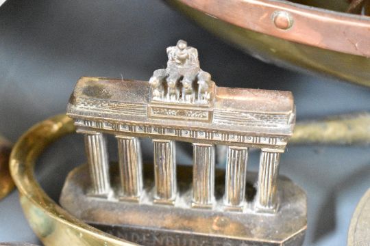 A large quantity of late 19th to 20th-century metalware, to feature a large copper bowl; a selection of brass candle sticks; Middle Eastern-style engraved vases; brass sconces; brass toasting forks; a brass and copper tankard having grape detailing and more, some marked but not all, (1 shelf full), condition is consistent with age and use, having visible areas of surface wear to all, sold as seen.