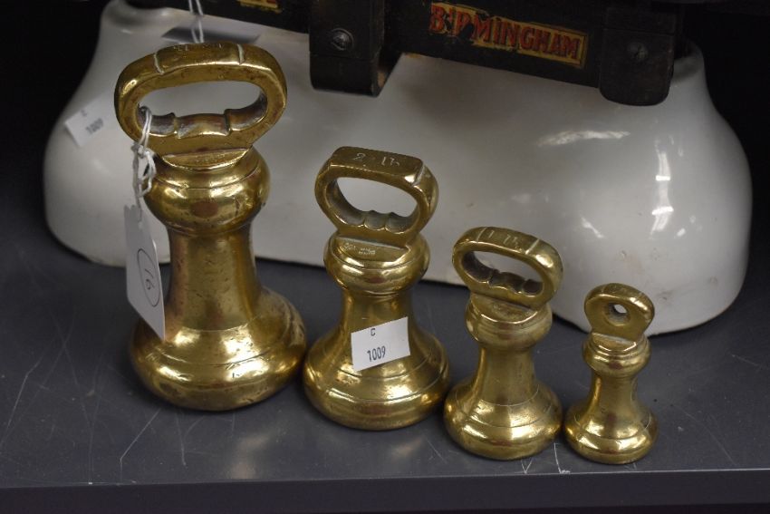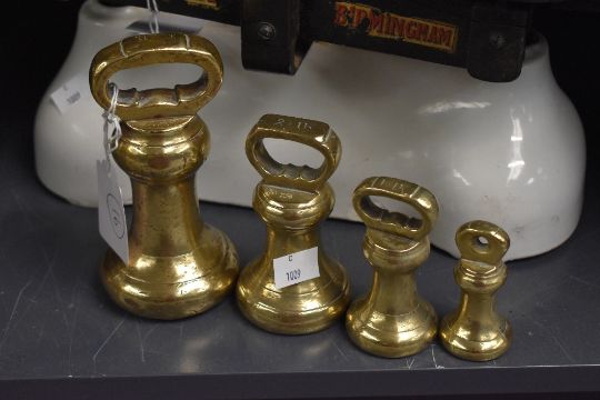 A large late 19th to early 20th-century W and T Avery Limited of Birmingham cast-iron industrial weighing scale, having a large removable polished brass pan; sold with a set of Victorian brass graduated bell weights, all marked, ( 1 scale and 4 weights), condition is consistent with age and use, visible areas of surface wear, sold as seen.