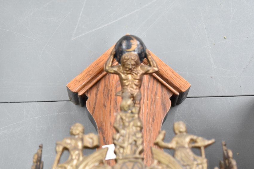 A fine mid 20th-century Dutch Warmink (Wuba) Zaandam Zaanse-style wall clock, featuring an ornate decorative finial figure of Atlas hoisting the moon, with ornate cherub and foliate clock face decoration having Roman Hours, an oak case and two heavy brass pear weights, male figure on horseback-formed pendulum is present, marked to face and inside back door, approximately 68cm in length, condition is consistent with age and use, having visible areas of surface wear, cracks to the side glass panels, one weight is detached from bottom chain which is rather tangled, sold as seen.