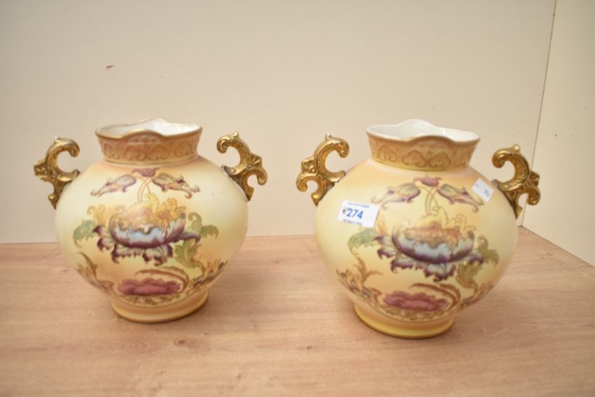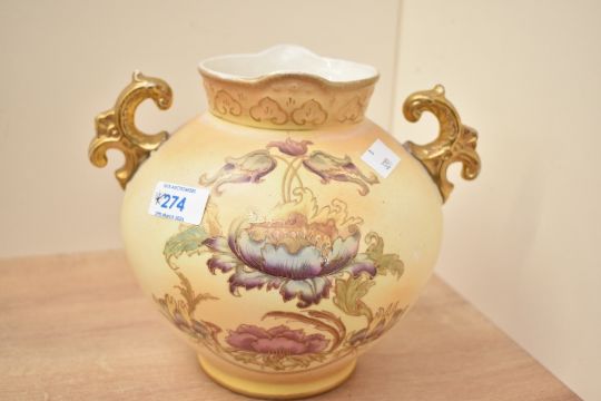 Two Victorian S. Fielding and Company pottery baluster vases with double gilded handles, renamed Devon Pottery in 1912, having a central floral pattern in warm pinks, greens, and soft creams framed by elegant scrolling foliage, each vase featuring a gently flared rim and rich ivory ground, marked to base, condition consistent with age and use, one vase has a large visible chip to the left handle and both show general areas of wear to the glaze.