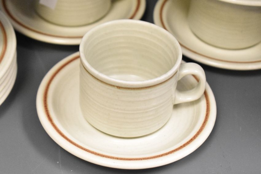 A selection of mid to late 20th-century Denby stoneware 'Russet' part tea set, featuring a minimalist design of a chocolate brown glaze with a speckled earth toned base section with a small stylised handle, to include teacups, saucers, milk jug and sugar bowl; sold with a selection of Churchill Homespun stoneware 'Trellis Blossom', featuring bright orange and yellow floral decoration, to include cups, saucers, and small side plates, all marked to base, (approximately 22 pieces of Denby and 19 pieces of Churchill Homespun), condition is consistent with age and use.