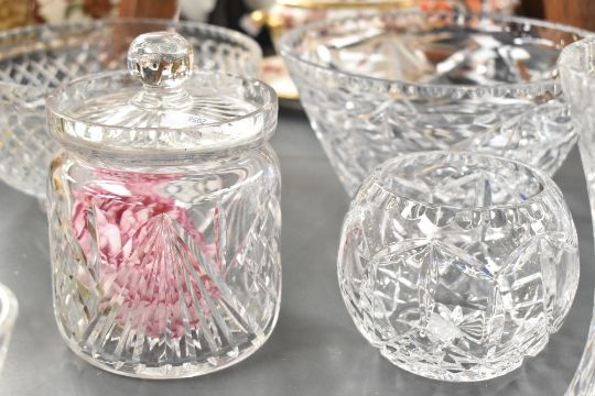 A large selection of 20th-century crystal cut glass, to feature large bowls, vases, decorative baskets, bud vases and more, all unmarked, (approximately 20 pieces), condition is consistent with age and use, no visible chips, cracks or fixed damage, sold as seen.