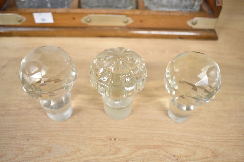 A Victorian oak three-bottle tantalus, having white metal mounts and three crystal-cut glass decanters with faceted stoppers, unmarked, 33cm in length and 30cm in height, condition is consistent with age and use, visible surface wear to all, small chip to base of one stopper, two keys are present and they do open the lock with ease.