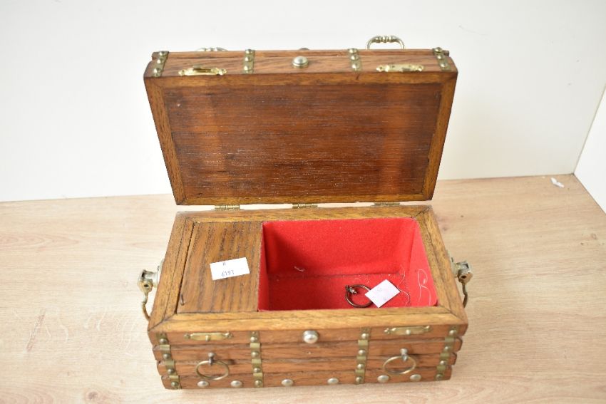 Thought to be 20th-century Reuge Oriental-style wooden musical box, having metal rivets, handles and floral motif decoration, upon four riveted feet, marked to winding key to base, 20cm, condition is consistent with age and use, does not freely wind and play music, presumed to have later front clasp fittings and additional rivets, sold as seen.