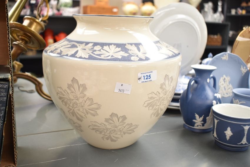 A large late 20th-century Wedgwood Interiors earthenware vase, featuring a delicate blue floral and foliate motif decoration; sold with a matching pair of candlesticks, all marked to base, (3), condition is consistent with age and use, no visible chips or cracks.