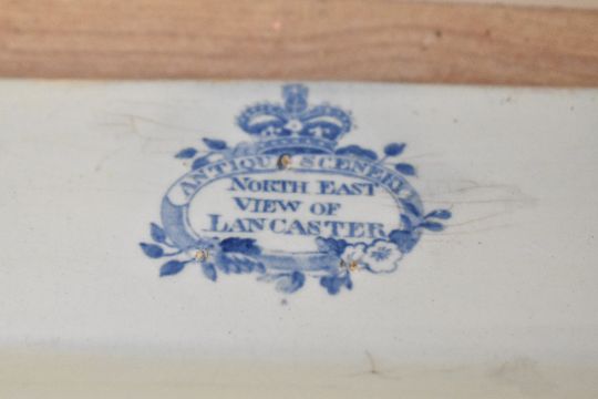 Of Lancastrian interest, a large early to mid 19th-century 'Antique Scenery: ' blue and white transferware charger, featuring a central North East View of Lancashire landscape scene surrounded by a floral and foliate border, marked to base, 55cm in diameter, condition is consistent with age and use, visible areas of surface wear, some small sections of glaze wear to reverse, sold as seen.