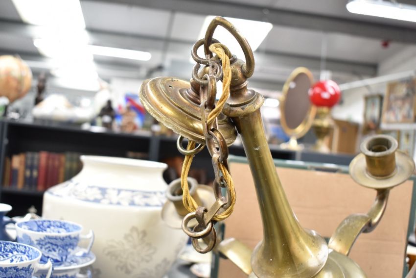 A large 20th-century Edwardian-style brass chandelier, featuring five scrolled arms each terminating with a circular bobeche, having a graduated finial, unmarked, approximately 60cm, condition is consistent with age and use, sold as seen.