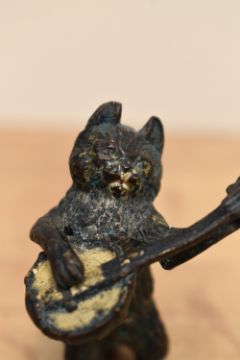 Three presumed late 19th to early 20th-century Franz Bergman (1861-1936) Austrian cold painted Bronze-style 'Musical Cats', to feature a guitarist, cellist and Banjoist, all unmarked, tallest is approximately 6.5cm, condition is consistent with age and use, visible surface wear to paint and bronze, some sections show minor bending, sold as seen.