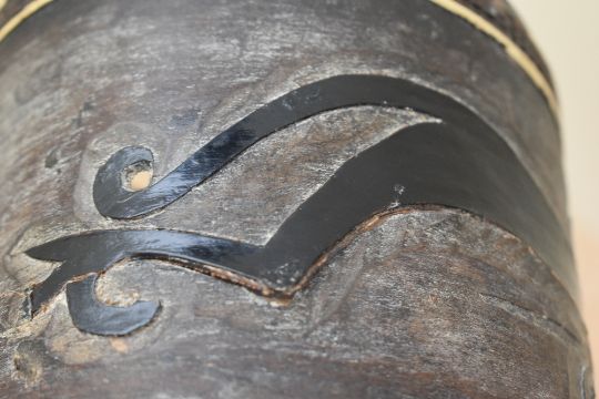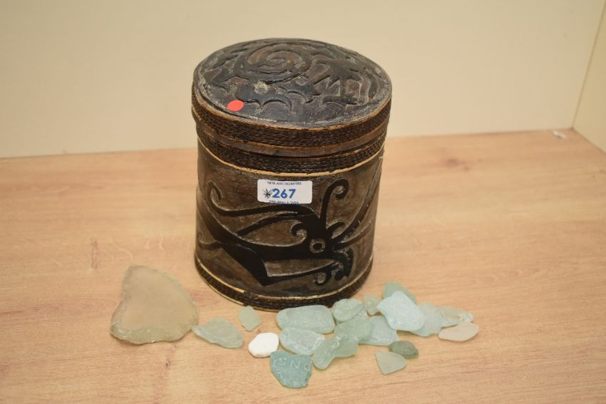 A 20th-century Chinese hand carved wooden box, of cylindrical form, featuring a large dragon-like creature around the body, a scrolled foliate design and weaved plaited detailing to the lid, to include inside a number of large sea glass chips, unmarked, 15cm, condition is consistent with age and use, visible areas of surface wear, with two holes to the body of the box and a large horizontal crack.