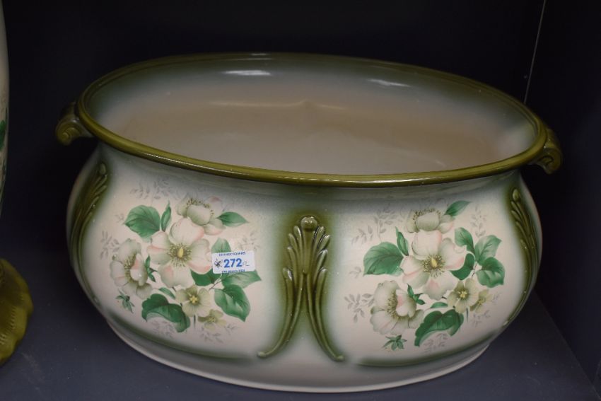A large late 20th-century ironstone Blakeney Pottery Limited of Staffordshire basin; sold with a matching decorative vase, both featuring deep green foliate and floral decoration with scrolled detailing, marked to base, (2), condition is consistent with age and use, visible surface chips to and around rim of vase with surface wear to both pieces.