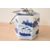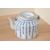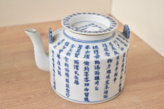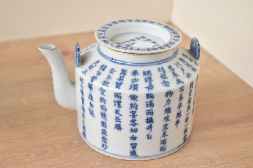 Three presumed mid 19th to early 20th-century Chinese blue and white ceramicware, to include a porcelain 'poem' teapot featuring Chinese calligraphy; a pottery stem cup featuring floral and foliate motifs with figural detailing; and a porcelain hexagonal two-section teapot and warmer, featuring a continuous coastal lanscape motif with delicately formed metal handles, some marked but not all, (3), condition is consistent with age and use, no large visible chips or fixed damage, small crack to rim of teapot and metal wear to handles, all sold as seen.