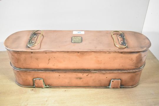 A late 19th-century copper tiered fish kettle, with foldable stand, marked ' Gardner of Edinburgh' to top, 44cm in length, condition is consistent with age and use, having visible areas of surface wear to metal.