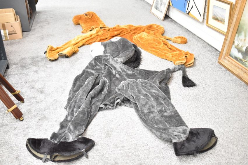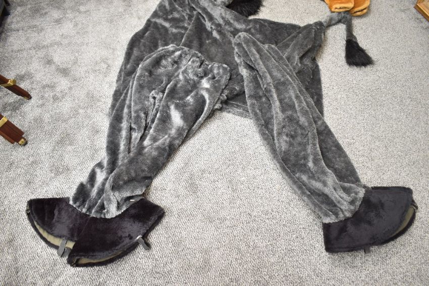 Two vintage animal pantomime costumes, comprising a large two-person camel and a two-person donkey example, both unmarked, (2), condition consistent with age and use, showing visible signs of wear but remaining suitable for pantomime performance - oh yes they are!