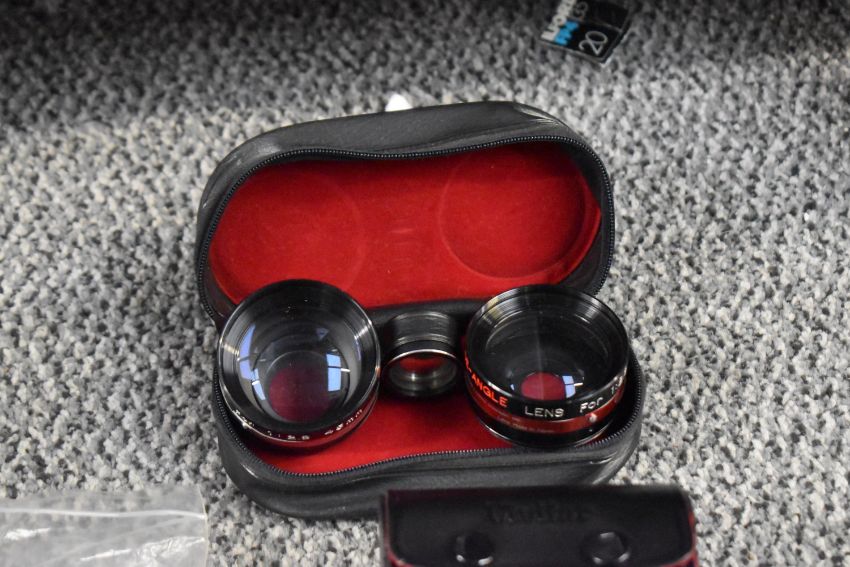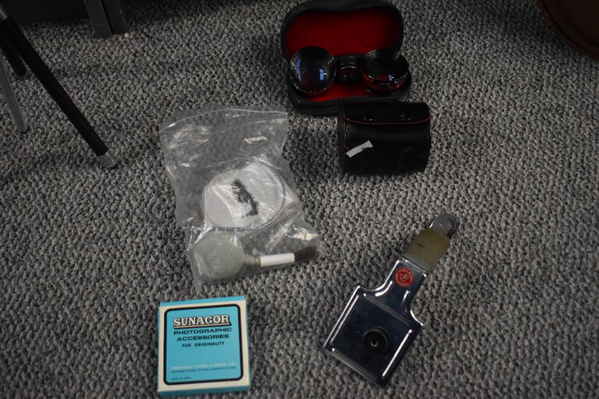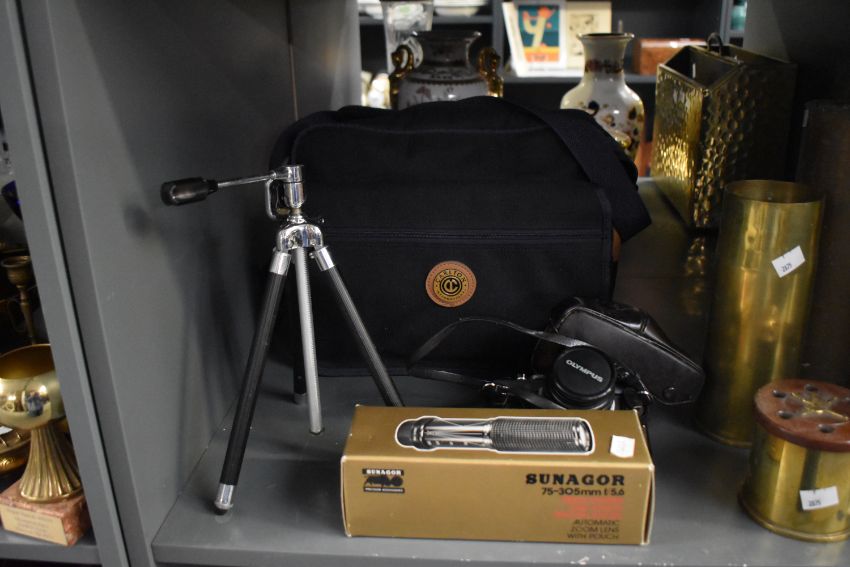 An Olympus OM-1 SLR camera with OM-Systam F Zuiko Auto S 1:1,8 50mm lens and Sunagor 70-305mm 1:5,6 lens and Petri Aux telepphoto and wide angle set in camera bag