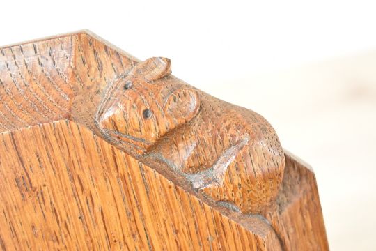 A 20th-century Robert 'Mouseman' Thompson (1876-1955) of Kilburn light oak cheese board/teapot stand, of octagonal form, featured an adzed surface with a graduated rim, featuring a small hand carved mouse atop, 19cm diameter, condition is consistent with age and use, having visible areas of surface wear and natural wood wear, two small areas of residue to rim, sold as seen.