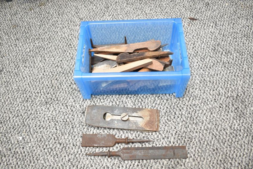 A quantity of 20th-century mixed carpentry hand tools, to include a selection of hand-forged wood auger bits; wooden hand planes of various sizes; presumed lathe cutting bits/chisels and more, (1 shelf), condition is consistent with age and use, all sold as seen.