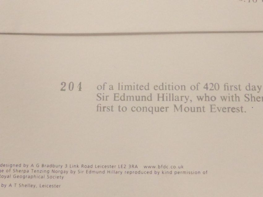 GB 2003 EXTREME ENDEAVOURS CONQUEST OF EVEREST BRADBURY COVER SIGNED EDMUND HILLARY Fine Bradbury cover from 2003 to commemorate the 50th Anniversary of the Ascent of Everest. Cover signed in blue ink by Sir Edmund Hillary. Cover number 204. Cover double dated with trio of 1st NVI's. Hillary was the first person to climb Everest.