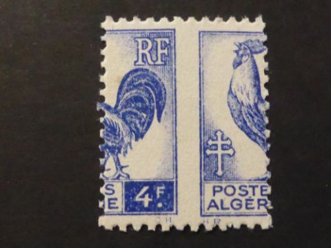 ALGERIA 1944 4F COCKERAL, WITH MAJOR MIS PERFORATION, UNMOUNTED MINT Fine and unusual example of this 1944 value from Algeria, with a major misperforation to middle (piquage a cheval). Unmounted mint.