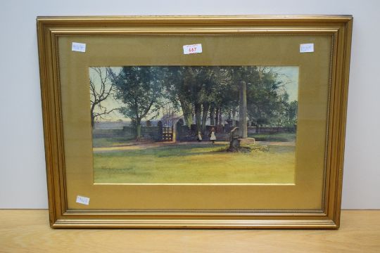 *Local Interest* H.B. Simpson (British 19th Century) watercolour, depicting young children near a monument in a park or church yard, signed and dated (1894) lower left, within gilt mount and moulded gilt frame, under glass 42cm x 24.5cm & 61cm x 44.5cm overall.