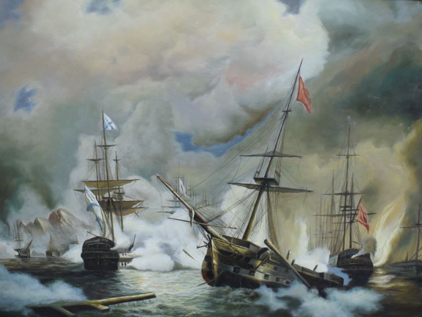 A 20th Century oil on canvas, depicting an 18th/19th century Naval battle at sea, unsigned or attributed, within moulded gilt frame, 100cm x 74.5cm & 132cm x 105cm overall.