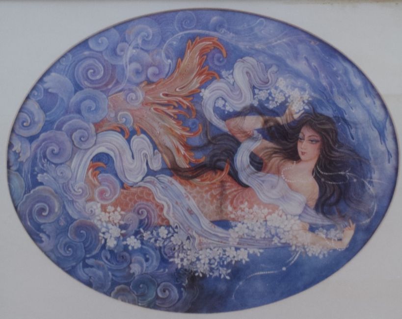A contemporary lithograph, depicting an orange mermaid in purple toned waters, artist unknown, within card mount and moulded frame, under glass 29cm x 22cm & 50cm x 42cm overall.