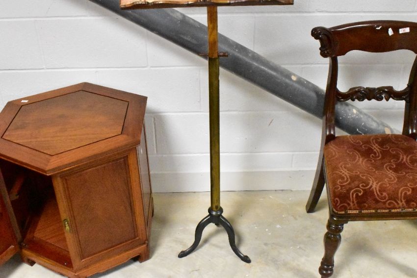 A 19th century oak, brass and cast iron pedestal duet music stand, the opposing rests over the central oak and brass columns and cast-iron base formed as three down swept legs 142cm as illustrated