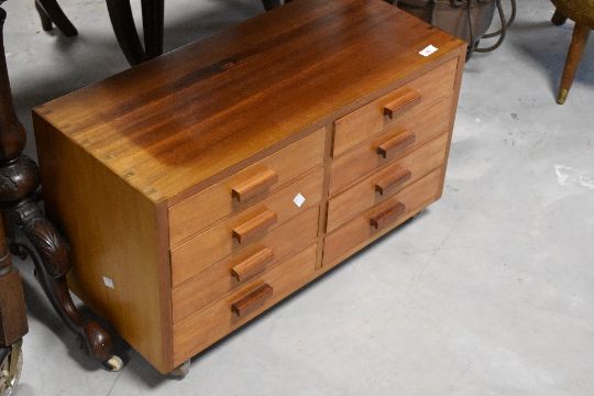 A vintage teak specimen/collectors chest of 8 drawers (some with dividers) on shepherds castors, dimensions approx. 69 x 31 x 40cm