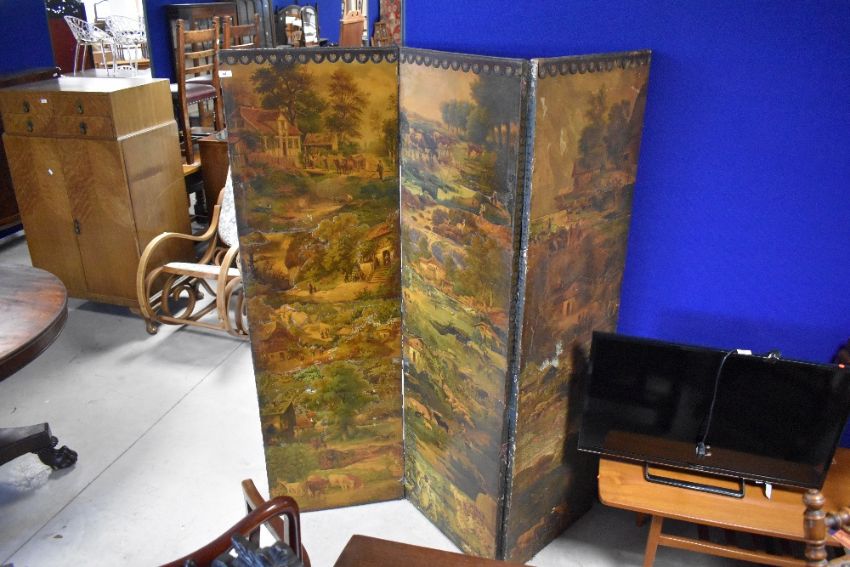 A 19th Century trifold room divider /modesty screen having pictorial decoupage style decoration to both sides, depicting rural scenes, and leather trim, height approx. 166cm