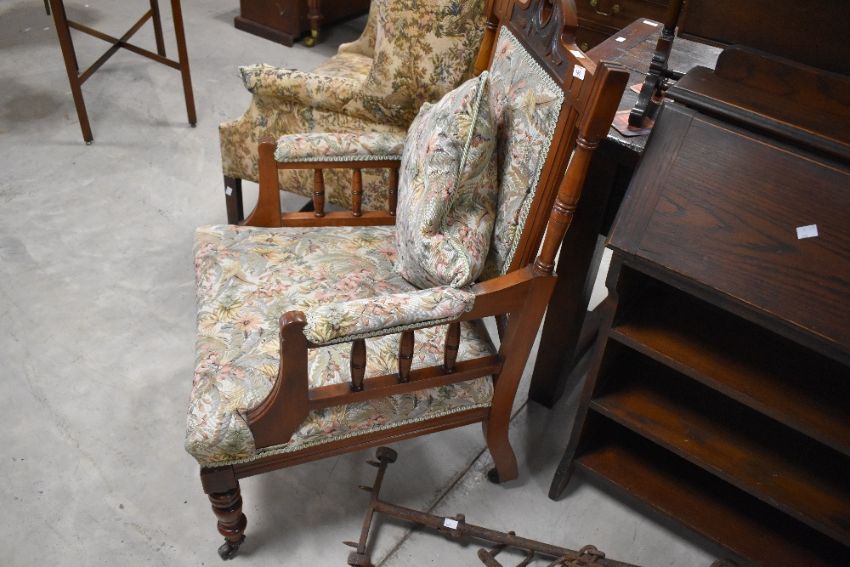 A Victorian mahogany armchair having spindle arm supports, later foliate upholstery and turned legs terminating in pot castors, width approx. 66cm