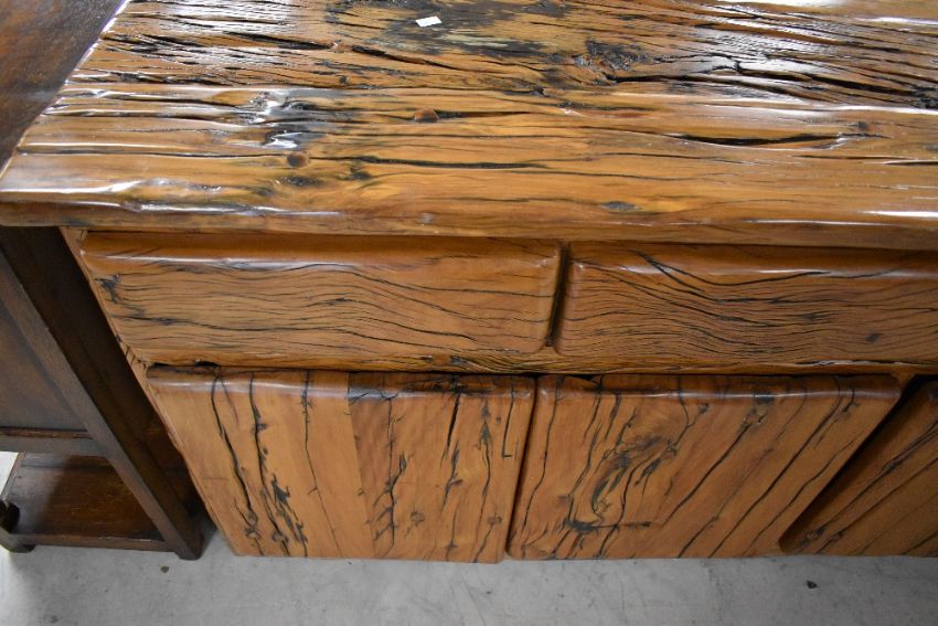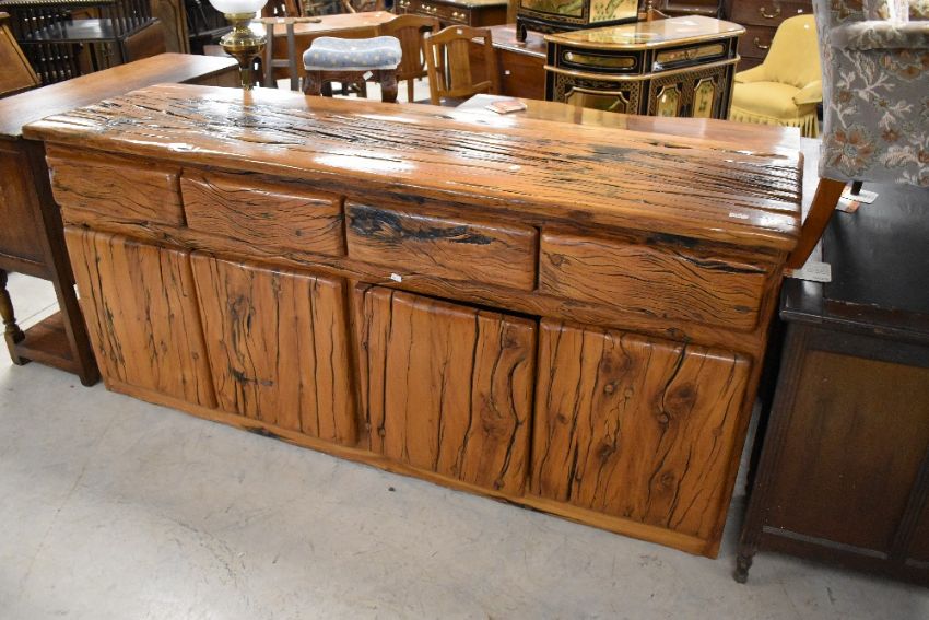 A substantial and impressive rustic wooden sideboard, thought to be Australian Jarrah, having an oblong top over four frieze drawers with cupboard below 87cm x 200cm x 57cm very heavy.