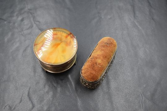 A George V silver powder pot, of circular form having a faux tortoiseshell lid, raised on three legs, marks for Birmingham 1923, rubbed makers mark, along with an Edwardian silver mounted pin cushion, of rectangular form having scroll decoration, marks for Birmingham 1904, indistinct makers mark, 93g gross