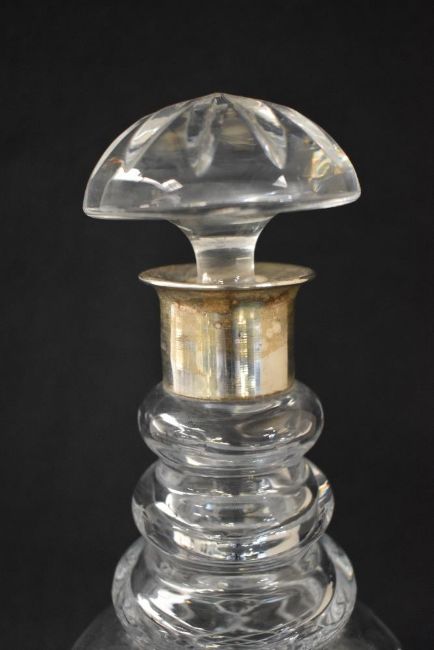 A 20th century silver mounted glass decanter, the flared silver top over a step moulded neck and bulbous form glass body, rubbed marks for London, indistinct date mark, maker Israel Freeman & Son Ltd, 25cm