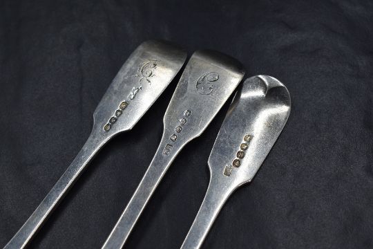 A group of three 19th century silver fiddle pattern forks, two having 'C' initial engraved, marks for 1808, 1820, 1836, makers Thomas Wilkes Barker, William Eaton, Thomas Wallis II, 211g gross