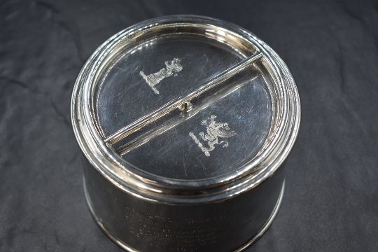 An Edwardian Scottish silver presentation tea or tobacco caddy, of circular form having moulded rims with two heraldic crests to the lid and personalised inscription to the body, marks for Edinburgh 1906, maker Hamilton & Inches, 11cm diameter x 8cm high, 311g. Some small dents to body