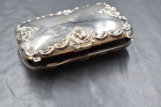 An Edwardian silver purse, of hinged rectangular form having embossed scroll decoration and blue fabric interior, marks for Birmingham 1905, rubbed makers mark, 9cm x 6cm, 72g