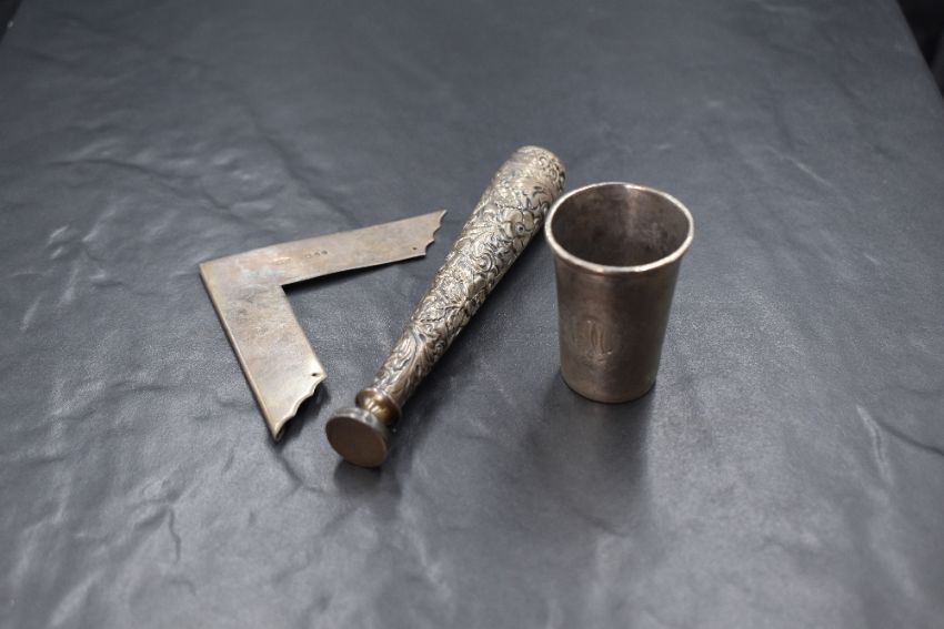 A 20th century silver vesta and wax seal, having ornate floral scroll decoration to the body with a screw top compartment to the body, marked Sterling, along with a white metal shot measure with indistinguishable marks, and a silver book corner cover, marks for London 1895, maker Charles & George Asprey, 56g gross silver weight