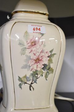 Two 20th-century ceramic table lamps, having delicate pink floral decoration with gilded detailing and cream circular shades, unmarked, (2), condition is consistent with use, visible surface wear and one has a splash of paint to the base.