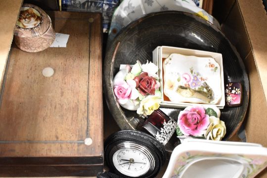 A vintage vanity set, a set of two blue and white tiles depicting two horses pulling a cart stacked with beer barrels, a small octagonal Royal Crown Derby 'Derby Posies' pin dish in original box, a Royal Doulton posy pot and another similar and a ladies Seiko gold tone watch etc.