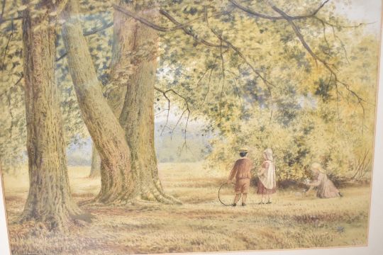 Archibald Jones (British 19th/20th century) watercolour, children playing under large trees, signed and dated 1912 lower left, within a card mount and moulded frame, under glass 26cm x 37.5cm & 42.5cm x 55cm overall.