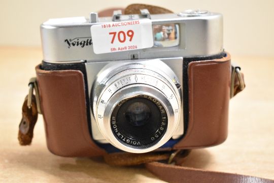 A Voigtlander Vito B camera with Color-Skopar 1:3,5 50mm lens in leather cover. Slight dent just above lens