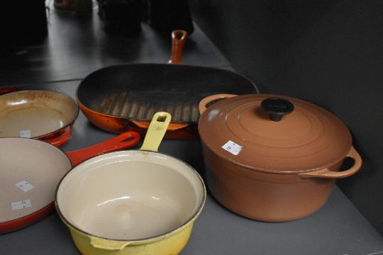 A selection of vintage and contemporary Le Crueset enamelled cast iron kitchenware, to include pots, pans and a grill pan, to feature the red, yellow, orange and light brown colourways, all marked, (approximately 7 pieces), condition is consistent with age and use, very much in a used condition with visible surface wear, scratches and marks, all sold as seen.