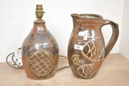 Of local interest, a 20th-century Iain Dennis (1947/8-2006) of Egermont, Cumbria studio pottery lamp base and large ewer, both having a soft brown ground and tertiary decoration of stylised swimming fish or fish-like scale decoration, both marked to base, approximately 23cm and 25.5cm in height, condition is consistent with age and use, having some small wear to sections of glaze and surface wear but no visible cracks or fixed repair, both sold as seen.