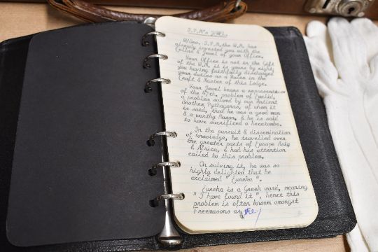 Of Masonic and East Lancastrian interest, a selection of mid 19th-century to mid 20th-century Masonic regalia, to include a Masonic Craft Provincial Full Dress of Apron, Collar, and gloves for East Lancashire, having a large oval Silver Masonic Provincial Collar Jewel, stamped for London 1895 after George Kenning and inscribed 'P.P.S.G.W.E.L 15.15.01'; a Masonic Past Master jewel belonging to Lodge No. 5206 having a Silver Mason sqaure, stamped for Birmingham 1974 after Toye, Kenning & Spencer; a Grand Patron Medal; a Patron Medal; a Steward Medal and more, some marked but not all, (all items in a small brown leather case), condition is consistent with age and use, having visible areas of surface wear to all, some of medals are inscribed to reverse to a number of individuals, all sold as seen.