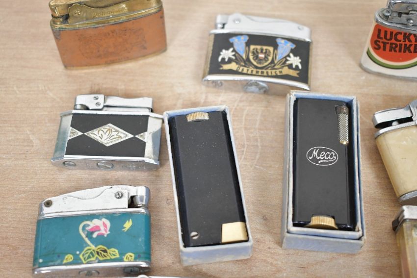 A quantity of 20th-century clipper lighters, to include an Evans pocket petrol lighter featuring an advertisement for American Lucky Strike cigarettes; two boxed Imperial Junior Lighters; a boxed Penguin lighter; together with a selection of novelty forms and other examples; some marked but not all, (approximately 16), condition is consistent with age and use, sold as seen.