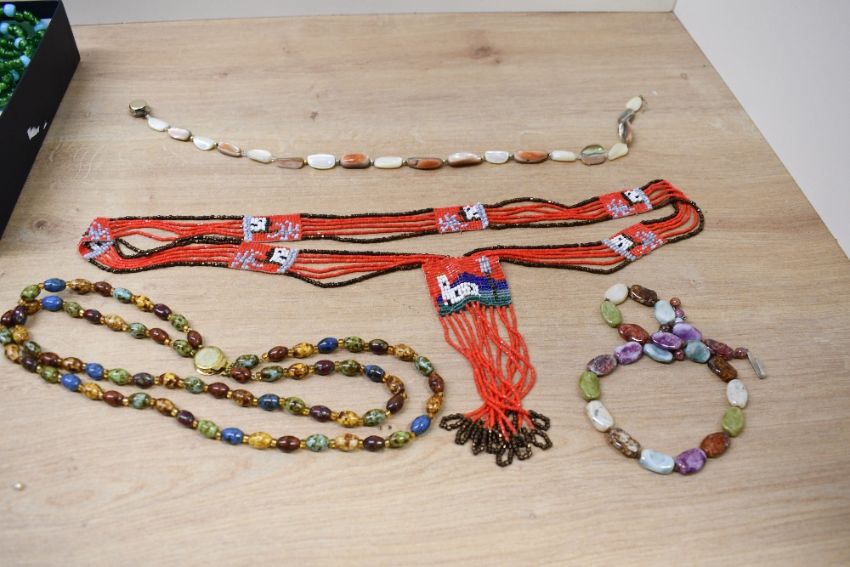 A small assortment of costume jewellery, including faux pearl necklaces and other beaded pieces
