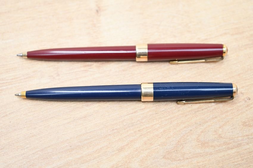 Two Parker 17 Super Duofold ballpoint pens in blue, red with gold trim