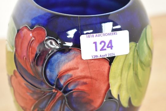 A 20th-century Moorcroft Pottery 'Hibiscus' vase, featuring tube-lined floral decoration upon a deep blue ground, marked to base, 18cm, condition is consistent with age and use, no visible fixed damage but small hairline crack from top of rim down 7cm with a small chip in the middle of this, sold as seen.