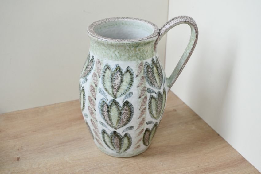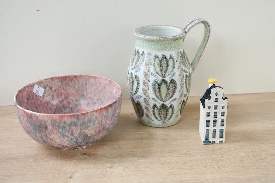 A mid 20th-century Denby stoneware jug after Glyn Colledge; sold with a S.Hancok and Sons of Stoke on Trent Coronaware bowl and a small Blue Delft's KLM by Bols house decoration, all marked to base, (3), condition is consistent with age and use, no visible chips, cracks or fixed damage, all sold as seen.