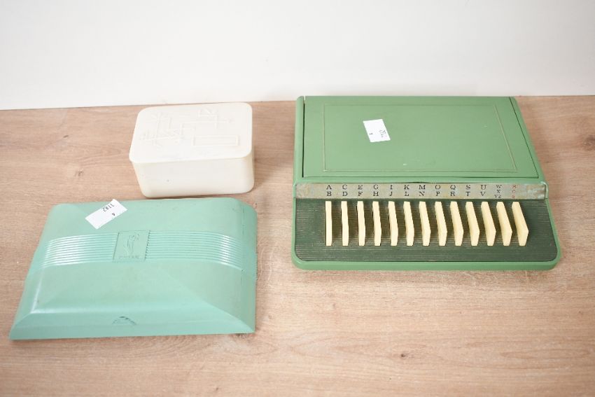 A quantity of 20th-century bakelite ware, to include an Art Deco Elo Ware box featuring a detailed relief of an Assyrian soldier on horseback fighting a lion and a small twist lid pot; an Eepware egg cup set with matching stand; a Stesco series chamberstick; an Art Deco hinged lid box with press-moulded deers to the lid; a pair of hexagonal chambersticks and more, some marked to base but not all, (13 pieces), condition is consistent with age and use.